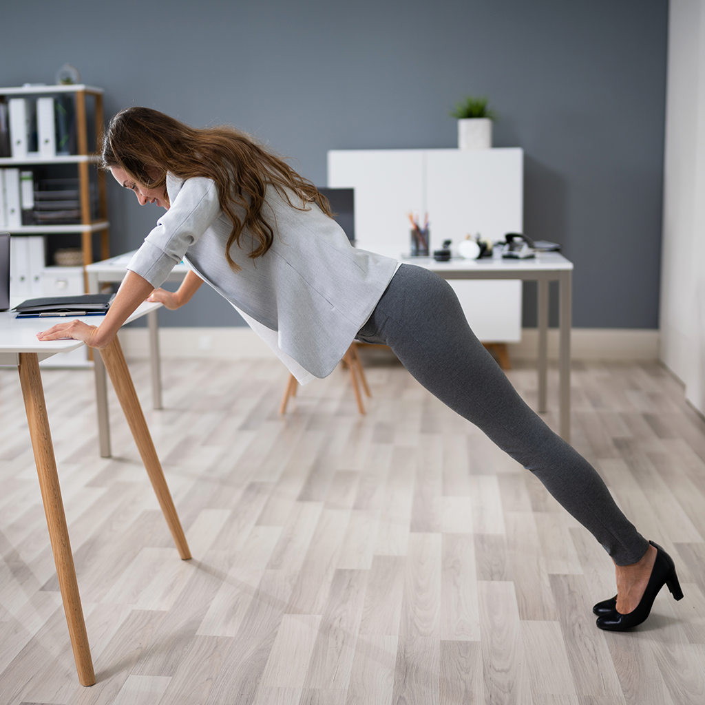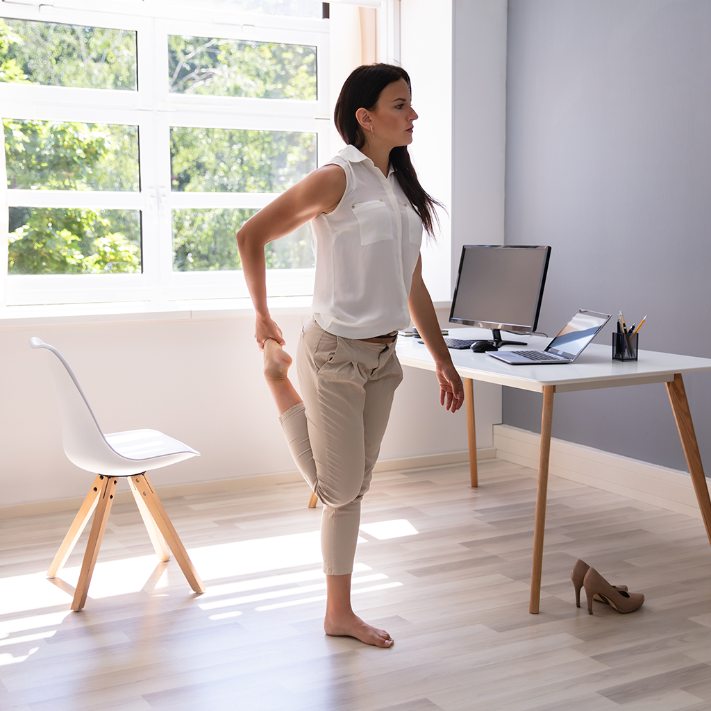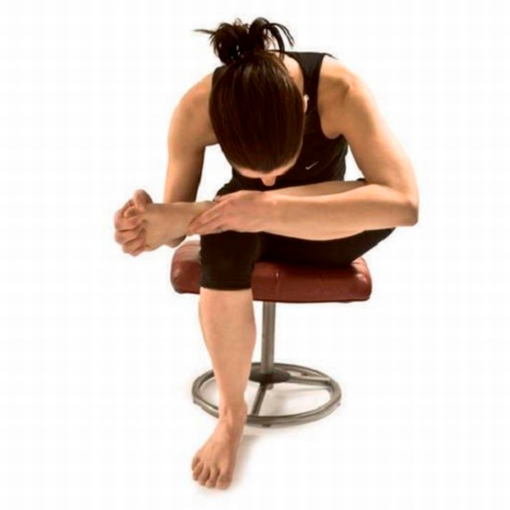 Em uma cadeira, você pode colocar um pé no chão e dobrar uma perna em um ângulo de 90 graus. Incline as costas para a frente e mantenha essa posição por 20 a 30 segundos.