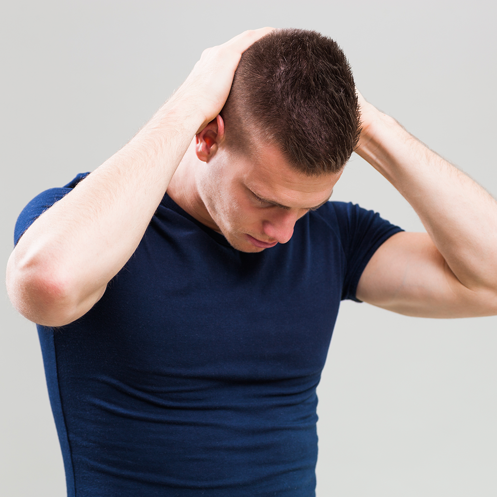 Depois disso, dobre o pescoço para a frente, traga a cabeça e cruze as mãos atrás da cabeça para um movimento de pressão. Siga esta pose por até 20 segundos.