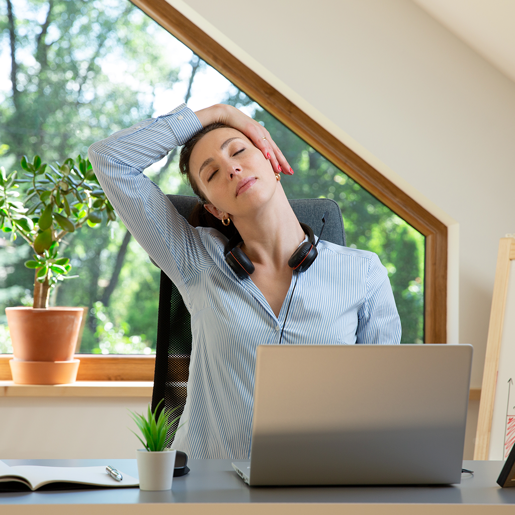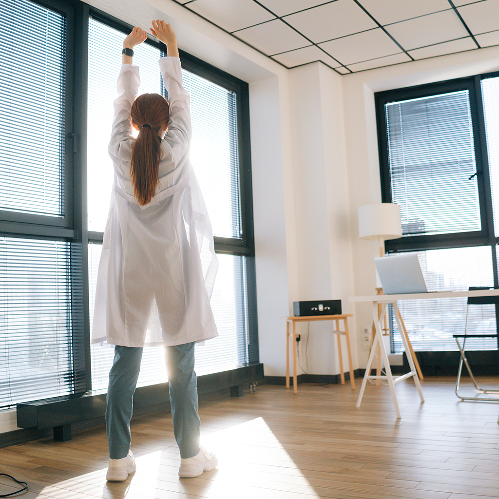 Durante o dia de trabalho, certifique-se de cuidar de si mesmo. Faça alongamentos corporais que ajudem a manter a mente e o corpo saudáveis. Além disso, não se esqueça de se hidratar com bastante água e comer a cada três horas.